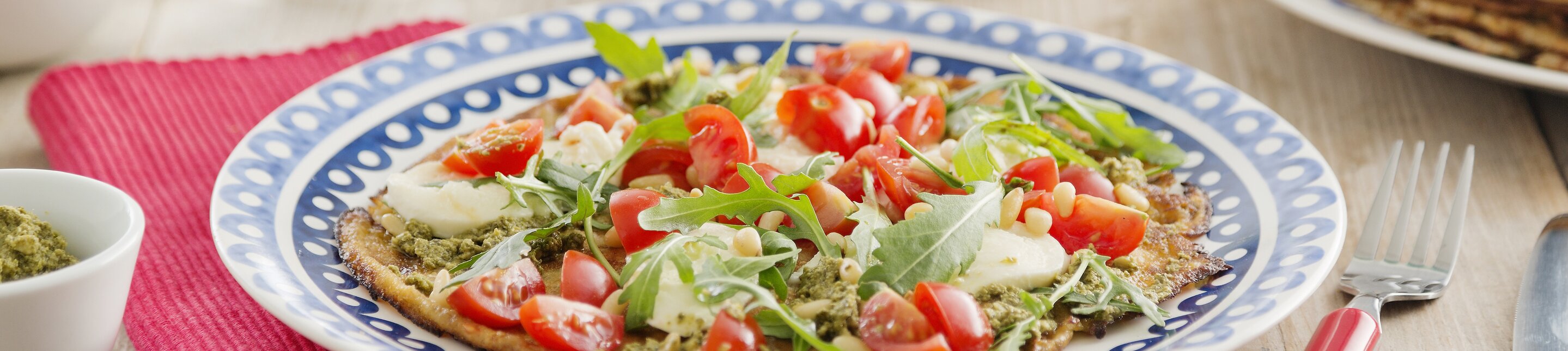 Volkoren pannenkoeken met mozzarella, pesto en tomaat