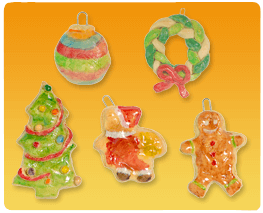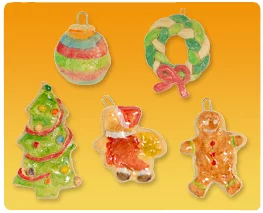 Beschilder de kerstboomfiguurtjes met de waterverf. Laat ze drogen en bestrijk ze aan beide zijden met blanke lak. Laat ze goed drogen. Rijg een mooi lintje door het paperclipje en hang ze in de kerstboom!