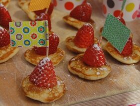 Ben je op zoek naar een leuke traktatie voor je verjaardag? Met dit heerlijke recept heb jij wat lekkers om uit te delen. Je maakt deze poffertjes zelf met de Koopmans Poffertjesmix en je maakt ze af met verse aardbeien en een feestelijk vlaggetje.