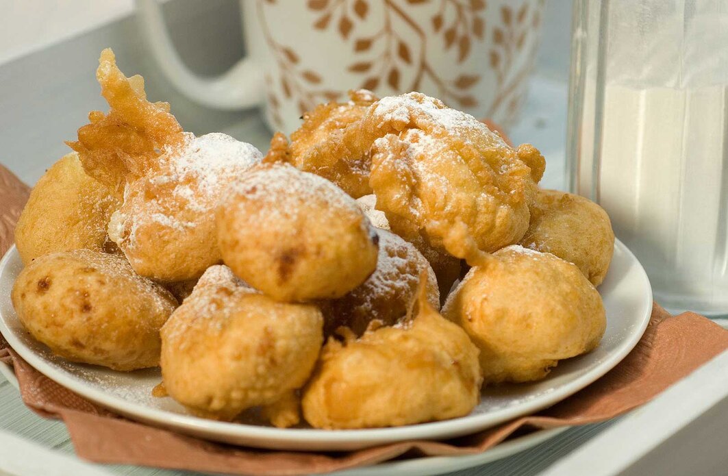 Haal de spijsballetjes op een vork door het beslag en laat ze direct in de hete olie glijden. Er mogen sliertjes deeg aan komen.