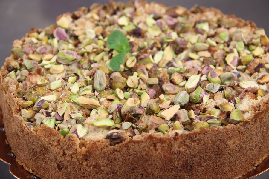 Appelkruimeltaart met perzik en pistache van Hadewych