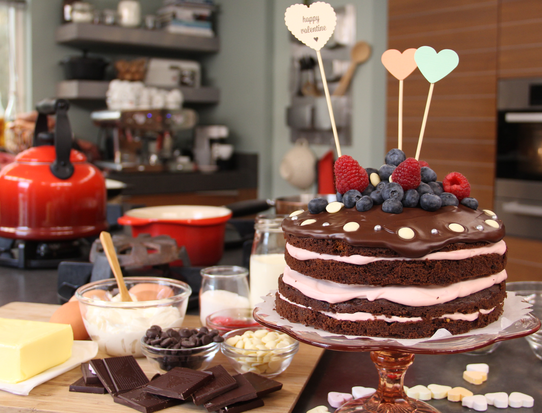 Ben je op zoek naar een feestelijke chocoladetaart? Met dit recept van Saakje maak jij een heerlijke chocoladetaart met 4 laagjes met een romige frambozenvulling en stukjes witte chocolade.