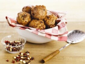 Laat de bolletjes beslag in de hete olie glijden en dompel ze even onder.