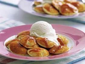Schik de poffertjes op een dessertbord (10 per persoon) en schenk de karamel hierover.