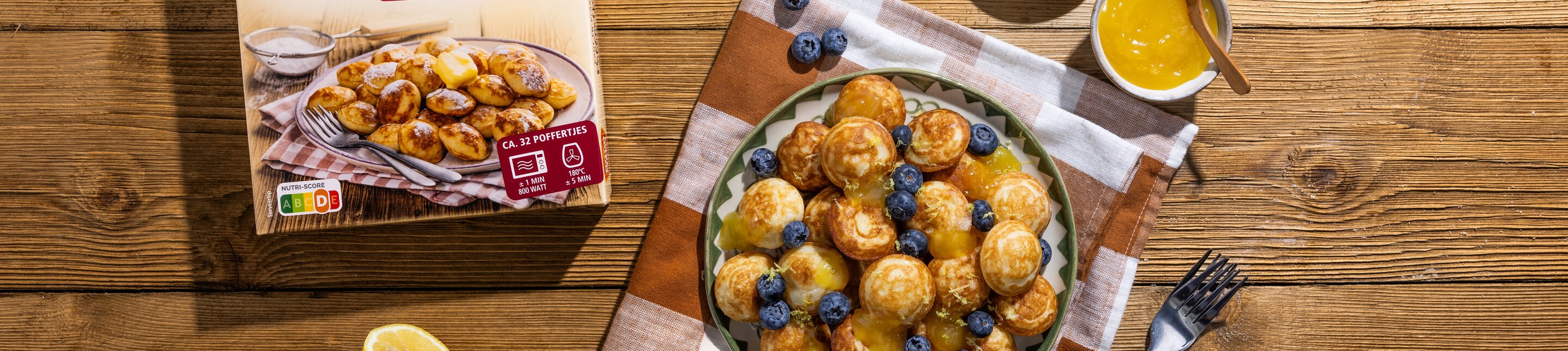 Kant-en-klare lemon curd poffertjes met blauwe bessen, wie wil dat nou niet? Voel de knapperige randjes van kleine poffertjes, gevuld met frisse lemon curd en overgoten met sappige blauwe bessen. Deze kant-en-klare poffertjes recept is een feest van licht zuur en vol zoet in één hap. Omdat deze Koopmans poffertjes kant-en-klaar zijn, zet je in een handomdraai iets bijzonders op tafel. Probeer het nu en geniet!