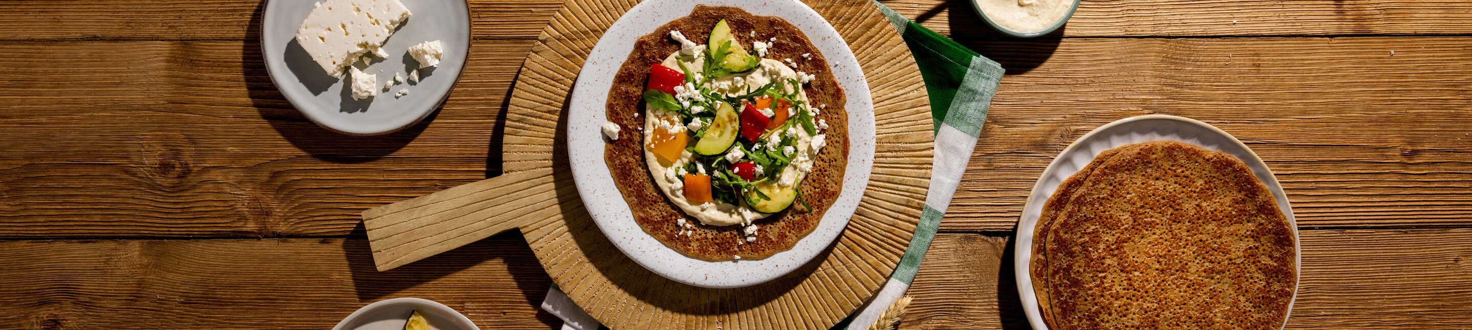 Kant-en-klare volkoren pannenkoeken met hummus, gegrilde groenten en feta
