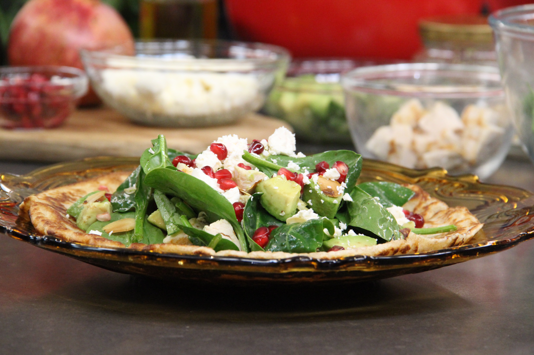 - Schik de salade op de pannenkoek en kruimel de feta erover.