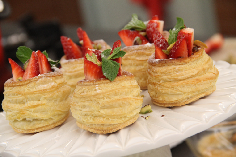 - Maak de mandjes af met een klein schepje slagroom en stukjes aardbei.