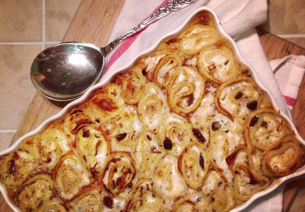 Klop de twee eieren met de slagroom los en mix 3 tl kaneel, 3 zakjes vanillesuiker en rasp van 1 citroen erdoor. Schenk dit over de rolletjes, zodat overal een laagje room in de schaal zit.