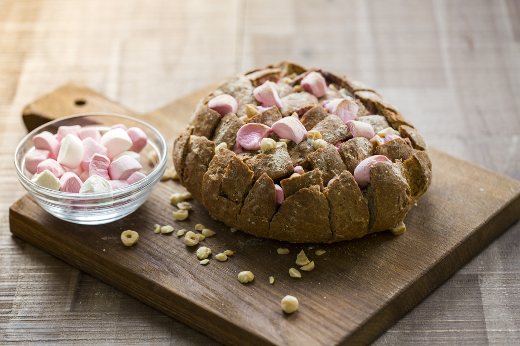 Snijd het brood aan de bovenkant kruislings in, zo maak je er een plukbrood van. Vul de inkepingen met de hazelnootpasta, marshmallows en grof gehakte hazelnoten.