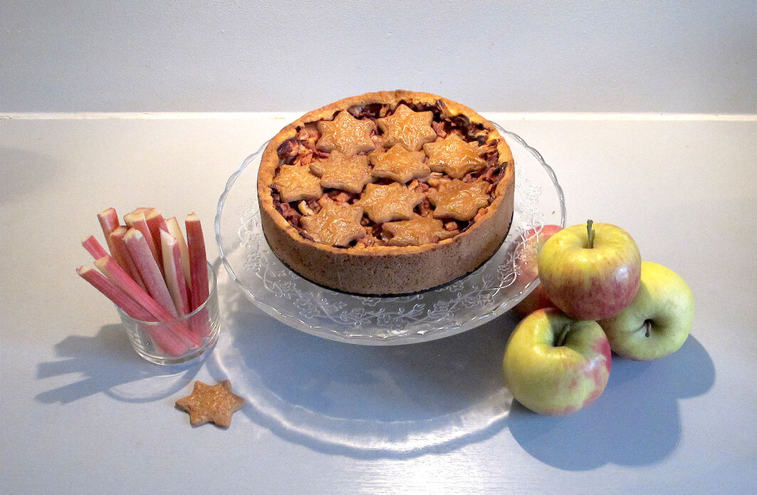 Bak de rabarber appeltaart in 60-75 minuten gaar en goudbruin.