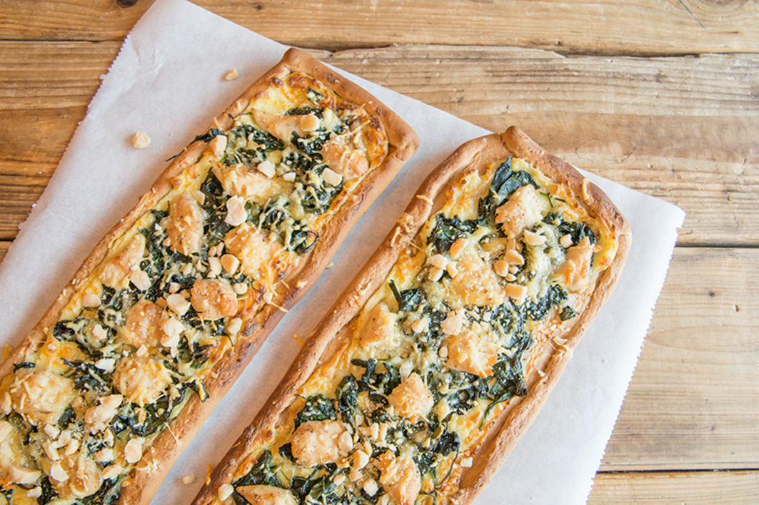 Volkoren pizza met bechamelsaus, kip en spinazie van Danna