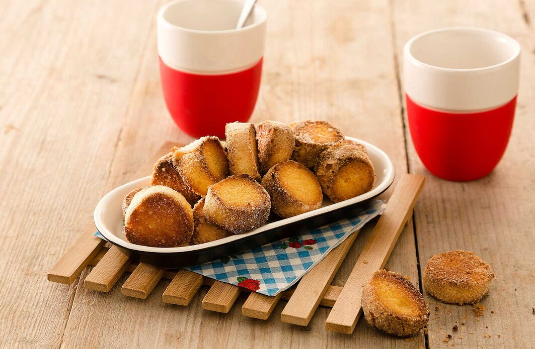 Bestrijk de spijsrollen licht met het eiwit en rol ze door de kristalsuiker.